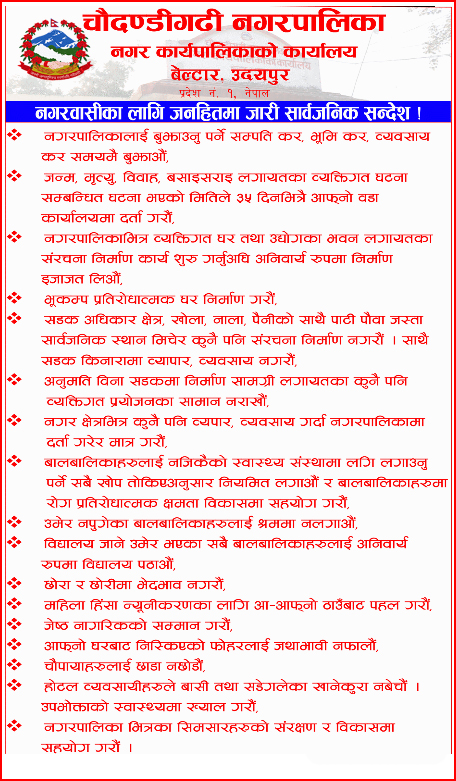 उता जिल्लाका प्रमुख जिल्ला अधिकारी, प्रहरी प्रमुखहरु सहित चौदण्डीगढी नगरपालिकाका प्रमुख, उपप्रमुख, प्रमुख प्रशासकीय अधिकृत, नगर स्वास्थ्य शाखा उपप्रमुख सहित को छलफलले नगर भन्दा बाहिरबाट आउने जोकोहीको पनि स्थानीय वडा अध्यक्ष, सदस्य र टोलबिकास संस्थाका अध्यक्षहरु बाट कडा नीग्रानी गराउने, सक्रमण भएकालाई होम आईशोलेसनमै राख्ने तथापि होम आईशोलेसनमा कुनै असहजता देखिए तत्काल कोभिड अस्पताल ल्याएर उपचार गरिने, कन्ट्र्याक ट्रेसिङ्गलाई प्रभावकारी बनाउने, निर्णय भएको बताइएको छ।